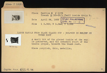 | Description: | Black glaze cup handle fragment. A small bit of the glazed inside of the cup preserved and the downward start of the handle proper, beneath the thumb rest. Dolphin in relief on thumb rest. Black glaze purplish, thin, metallic. | |