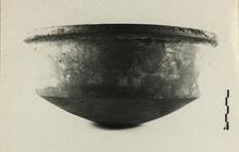 | Description: | Intact except for small hole through bottom. Open bowl with rounded bottom; a boss at the center inside, and a small depression outside. Vertical side wall; flat rim, projecting and sloping slightly inwards. Gritty red clay; heavy fabric. Burned black on bottom inside, and smoked on outside. ADDENDA Epirote fabric, as finds from Butrint and Corfu; and in mid-Roman phases at Nikopolis. [JWH, VII/01] | |
