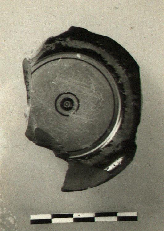 | Description: | Two-thirds of the upper part preserved with beginning of stem. Resting surface for pot sunken below heavily rounded rim. Excellent black glaze overall except resting surface, reserved with one large and three small concentric circles - glaze around a central dot. Raised ring around top of stem, painted purple. | |