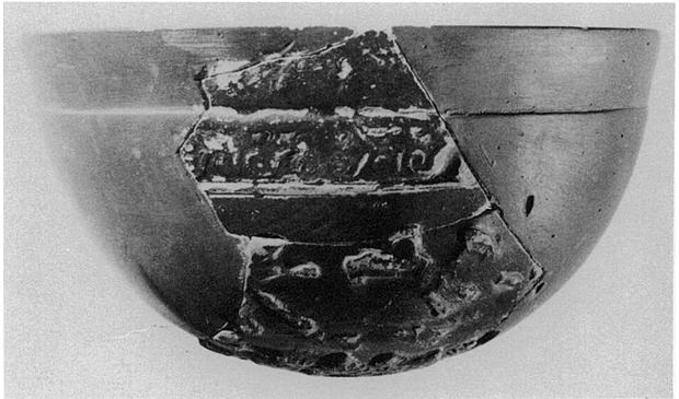 | Description: | Three joining fragments preserve part of side from center of bottom to below lip. Restored in plaster. Medallion with square-ended petals within a broad scraped groove. Above, a double row of rather large leaves. In the figured zone, above a band of flying birds, a goat, leaping right, followed by another animal. Upper zone, guilloche, with traces of small leaves above. Rather roughly made; the upper part not well pressed into the mould. Good black glaze, somewhat worn outside. | |