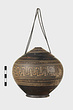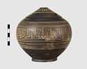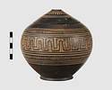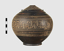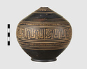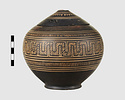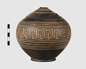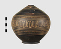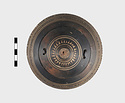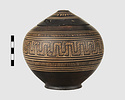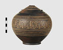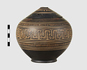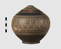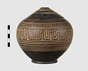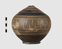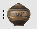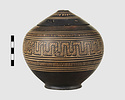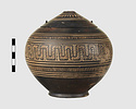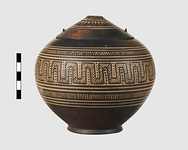 | Description: | Deep rounded pyxis on slightly flaring ring foot; the rim flanged inside to receive the lid and the flange pierced by two pairs of tie holes. The foot and lower body glazed, also the flange and a zone below the rim. A wide reserved zone at the shoulder and below, divided by triple horizontal lines (double line at the top) into a wide zone between two narrow ones. In the wide central zone, a band of hatched key pattern, with vertical dot rows in the bays between the keys. A zigzag in the upper narrow one; a row of short parallel verticals in the lower. The knob handle of the conical lid missing. Two pairs of tie holes pierced through near its plain edge, corresponding to those of the flange of the pyxis; no marks to indicate corresponding pairs. The lid glazed outside except for a zone below the handle decorated with tooth pattern; a single line below, and a triple line above (probably double, if the glaze at the upper edge continued up to the handle). Solid, rather dull black glaze with reddish-brown mottling, continuous between pyxis rim and lid, suggesting that they were painted (or fired) with the lid in position. | |