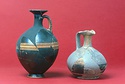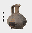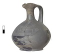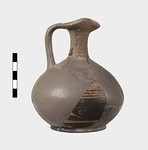 | Description: | Mended from many fragments, most burned, some not; large parts of the body and all of the handle missing. Restored in plaster. Low slightly flaring ring foot and round body with level of greatest diameter low; narrow neck and shallow trefoil mouth. Glazed to level of greatest diameter; below the shoulder a hatched maeander running left between triple lines below and double above. Latticed triangles on the shoulder (four). The neck narrowed and bordered above and below by double lines; between them a triple band of key pattern. The mouth, and the neck under the handle, glazed. Clay buff to gray when burned; thick black glaze, badly peeled: a narrow reserved zone filled by a horizontal line around the lower body above the foot. | |