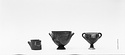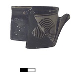 | Description: | Four fragments of the rim, of which one does not join, and one handle of a goblet with horizontal rolled handles and very slightly flared rim. The handle zone reserved and decorated to each side apparently with a latticed zone bordered by triple verticals at each side at the center, and a set of seven compass-drawn concentric circles, dotted at the middle, to each side. A horizontal line below the glazed lip; a glaze stripe with hanging tails on the outer face of the handle, and hanging tails from its attachments. The inside glazed, with a reserved line at the lip. Buff clay, thick solid dullish black glaze, in places slightly metallic. | |