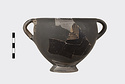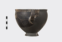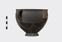 | Description: | Mended from many pieces, some burned and some not. Profile complete with one vertical handle; but most of body at one side, and of foot missing. High flaring ring foot, deep rather pointed body; short rim. Body entirely glazed, except for short rectangular panels reserved at center of handle zone front and back, and decorated with sections of quadruple key pattern. Two reserved lines outside, and one inside the rim; inside glazed, with reserved dot at center of floor. Ladder pattern on the outer face of the handles. Thick solid rather dull black glaze, somewhat peeled when burned. | |