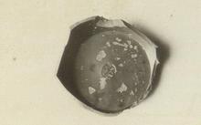 | Description: | The ring base and part of the steep sides of a Western Sigillata bowl. In the interior of the bowl, not quite in the center, is a circular stamp carelessly impressed: <graphic> Red-brown clay; good red glaze. | |