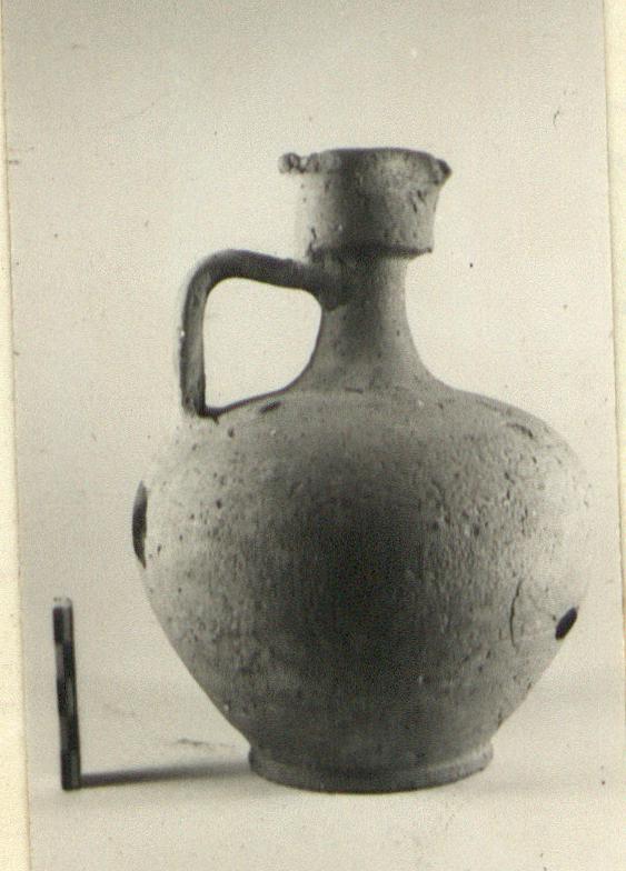 | Description: | Several small holes in body; minor chips; otherwise unbroken. Small trefoil mouth with deep collar and rounded rim. Very narrow neck; plump body; ring foot. Roughly ribbed handle, from below collar. Buff clay and slip, full of white bits; unglazed. ADDENDA Non-Attic: Asia Minor(?) (GRE). | |