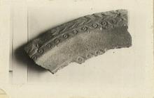 | Description: | Mortar or basin with flat lip, ring base. On the top of the heavy lip are two bands in low relief: an inner of hook-spirals, an outer of a laurel(?) wreath, with bunches of berries between the leaves. On the bottom of the basin, next to the break, another band of hook-spirals. Broken in antiquity and mended with lead clamps. Red clay, containing much coarse grit and broken tiles; pale buff slip on the outside and remains of this slip on the rim. | |