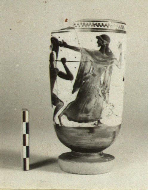 Description:   The foot and much of the wall to the shoulder preserved. Two warriors, one at the left, attacking the second, who kneels on one knee and thrusts backwards with his spear. Both wear crested helmets, corselets over a short pleated chiton; shields, greaves and swords. At right, a woman: chiton and himation, worn like a scarf over her shoulders; she runs right, hands upraised, and looks back towards the fighters.
