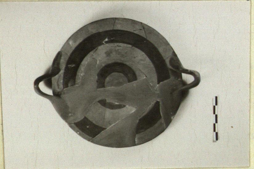 | Description: | About half preserved, with half of each handle, and two non-joining fragments. Similar to P 19322 (ΝΝ 4312) but with no depression at center of floor. Bands of dull black glaze. ADDENDA P 19322: Low base, flat floor with plain rim; added loop handles. A shallow depression at the center of the floor. Outside unglazed; inside banded with dull red glaze. | |