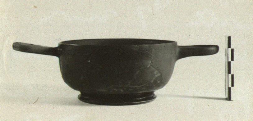 | Description: | About half the body and rim and one handle missing. Bolsal type. Flaring ring foot; wall above slightly concave. Slender handles drawn in at rim. Cluster of four palmettes stamped at center of floor. Good black glaze over all, except inside foot, reserved and decorated with broad and narrow glaze ring, and a smaller glaze circle near the center. Cf. Agora XII, no. 556. | |