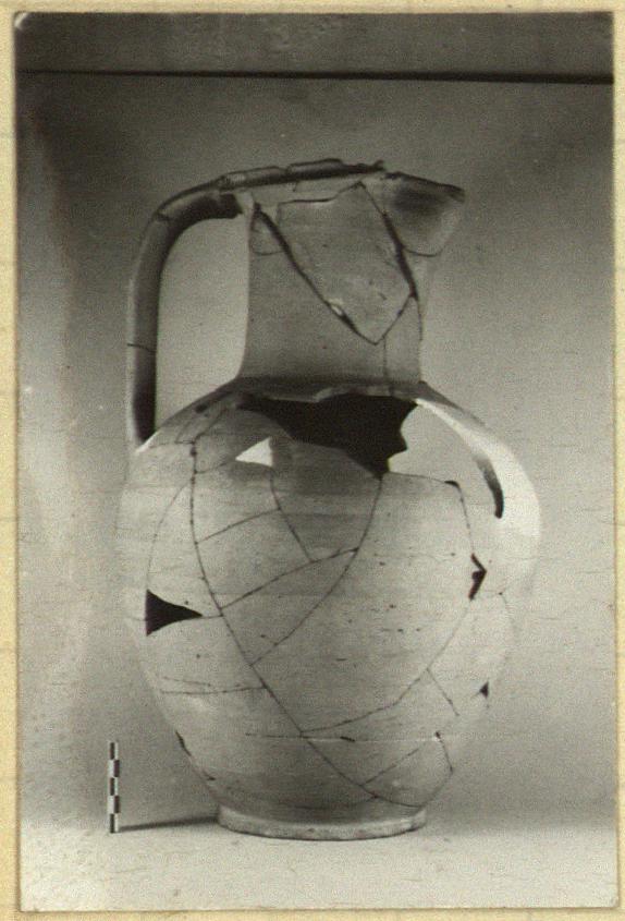 | Description: | Mended from many pieces; fragments of lip, neck and wall missing. Ovoid body; spreading ring foot; grooved trefoil mouth; rather straight neck; band handle. Four broad glazed bands around the body. Pinkish clay; pinkish-buff surface. | |