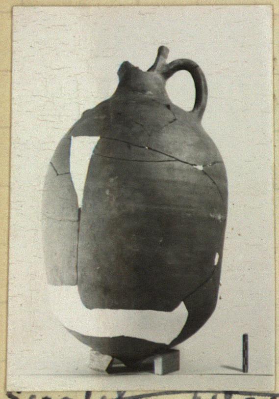 Description:   One handle, most of lip missing; wall fragments restored in plaster. Plump, almost cylindrical body, tapering slightly to rounded bottom finished with a small knob. Narrow neck tapering to thickened lip.