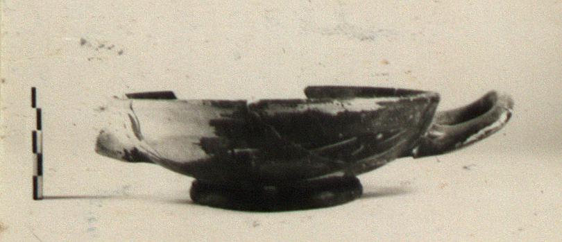 | Description: | Part of one handle and fragments of body missing. Shape similar to P 19405 (ΟΟ 725) but smaller and the foot less projecting. Resting surface reserved and space within foot, with small central circle. Good glaze, not very lustrous; worn on one side. ADDENDA P 19405: Lip concave on outside, offset inside. Heavy ring foot, flat on top and projecting; grooved around upper edge of vertical face. | |