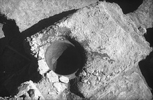 | Description: | A flower pot-shaped basin sunk in the floor; the bottom broken and about two-thirds of the floor missing; one fragment of floor found in place. Flat bottom, but apparently curved floor. Steep walls; flat-topped rim with angular profile. Unglazed light gray clay with black bits in it. | |