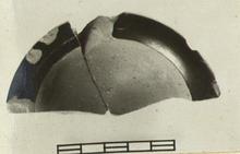 | Description: | About half preserved. Profile complete. Low flat base and shallow open body thickened to the rim which is flattened and slopes inward. Pinkish-buff clay; good black glaze on vertical face of base and on top of rim; dilute wash on interior, exterior and base. | |