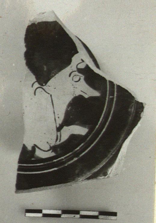 | Description: | Foot and floor fragment of stemless cup on moulded ring foot, the rim offset inside. Beast, right, in medallion inside; palmette under handle outside, and part of a kerchiefed head, to left. Within foot, reserved and glazed circles. Cf. Hesperia Suppl. 10 (1956), p. 19, under no. 41. | |