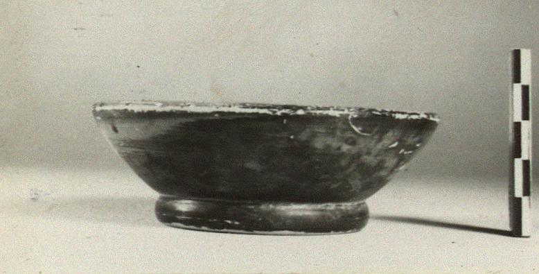 | Description: | Complete except for center of floor broken out. Ring foot and shallow heavy body, thickened at rim, which is broad and flat on top. Good black glaze over all, except inside foot and resting surface; fired reddish brown on the rim. | |
