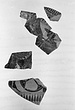 | Description: | Four fragments from the shoulder and wall of a large closed pot. Unglazed inside. On the upper shoulder, linked buds below tongues. Zeus(?) in a chariot, right, and a veiled woman; at left the tip of the hair and the drapery of another figure. Behind the team, Apollo with cithara. On a small fragment, the nose and topknot of one of the horses, and part of another(?). Red for the god's beard, eyebrow, eyeball and fillet; white for the woman's face; red for drapery borders and the horse's topknot. Very careful incision. ADDENDA Also with these, twelve additional fragments believed by the mender to belong. Cf. also P 17779. Preserved are two different lower borders of linked buds; the wheel of a chariot right, and the foot of one mounting; the rail of a chariot (not the same as on a)), and part of a figure; drapery fragments; and a hand holding a chariot rail. Red borders on the drapery, and red folds. Decoration also of groups of white dots and incised crosses. | |