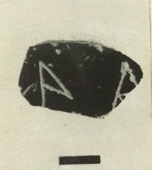 | Description: | From the floor of a black glazed skyphos with trace of foot along one edge. Glazed inside and out. Incised outside: <graphic> | |