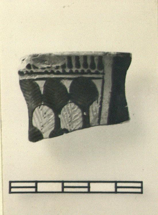 | Description: | Small fragment from rim and wall. Panel decorated with alternate glazed and reserved scales, veined with white and dilute glaze respectively. Upper border, tongues and dot. Glaze reddish and gray in places on the outside; good black within. Clay pinkish-buff. Cf. AJA 58 (1954), pp. 192, 194. | |