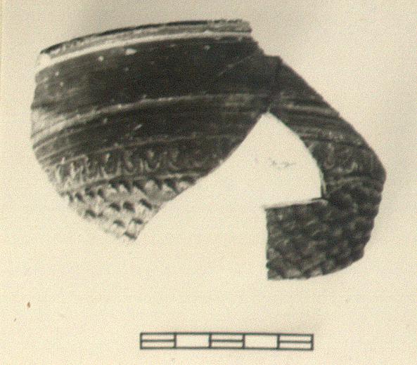 | Description: | Three joining fragments giving part of lip and upper wall. Small imbricated leaves on wall; band of egg and dart above, with grooves about that. Scraped groove at top of lip. Pinkish-brown clay; dull worn black glaze. | |