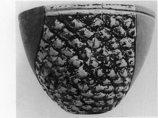 | Description: | About one-fifth of bowl preserved, profile complete. Restored in plaster. Steep wall; plain vertical rim. Groove bordered by ridges just under lip. Wall completely covered with nodules. Eight-petalled rosette with petals separated by "spokes" as medallion; surrounded by groove and ridge. Dark buff clay, worn and pitted inside. Poor black glaze. | |