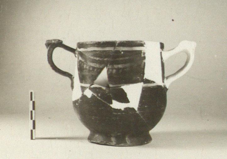 | Description: | One handle and much of wall missing; restored in plaster. Ivy leaf thumb grip. Necklace in applied white in band formed by two heavy grooves below lip. Body widest below middle. Plain, heavy, slightly spreading ring foot. Orange, slightly micaceous clay; black glaze shading to red. | |