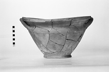 | Description: | Small part of rim and wall missing. Profiled lip with groove around interior. Horizontally placed handles, round in section rising to touch outer edge of lip. Body incurving from base of handles to low, slightly convex ring foot. Buff clay with lavender core; traces of brown glaze on interior. Pot compressed out of shape in firing. | |