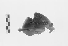 Description:   Mended from three pieces. Wall fragment of a biconical pot, a projecting keel at the middle, and the upper (or lower) part with a double wall. The edge of a handle (or spout) broken off near one extremity.