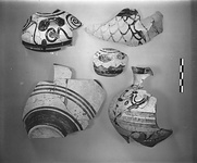| Description: | Squat type with small neck and bulging sides, the greatest width near the bottom. Mended from many pieces; one small horizontal handle preserved and wall from the start of the neck to beyond the inward curve at the bottom. Round neck and lower part of vase, plain bands of paint; spirals on the broad shoulder between. Orange-pink clay, buff at core; fine cream slip, lustrous paint. | |