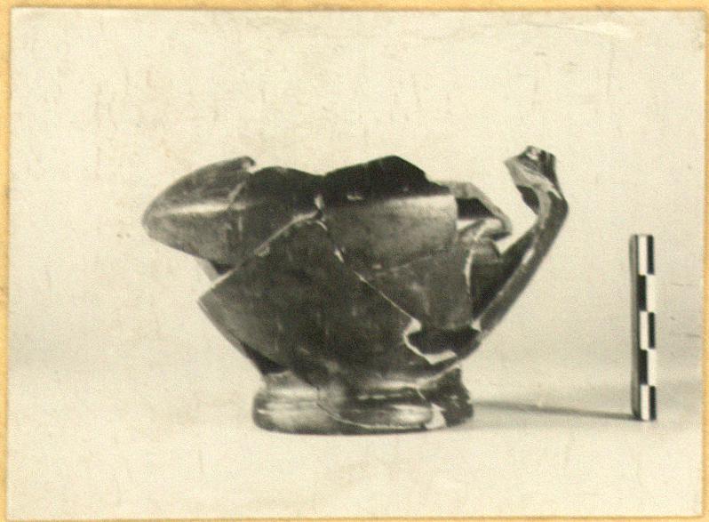 | Description: | Fragmentary; preserved from middle of shoulder to base, with missing fragments. Shoulder sharply set off from body. Stub of handle at edge of shoulder. Metallic black glaze. Pinkish-buff clay. | |