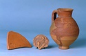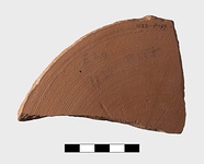 | Description: | Late Roman B plate fragment. Preserves head and shoulders of a figure, perhaps a priest, with left hand next to his shoulder holding a Latin cross which touches his head. He seems to be wearing a surplice. The eyes are large and round and the hair rendered by neat vertical strokes within the head line. Stamped or drawn very neatly in the wet clay. The figure is part of the center ornament of a thick flat dish that is broken neatly around the edge; two parallel concentric grooves run near the edge. Coarse red clay, lustrous red wash inside. | |