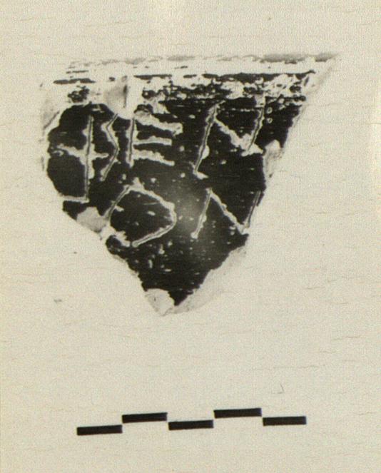 | Description: | Rim fragment from a semi-glazed krater. Incised inside: <graphic> | |