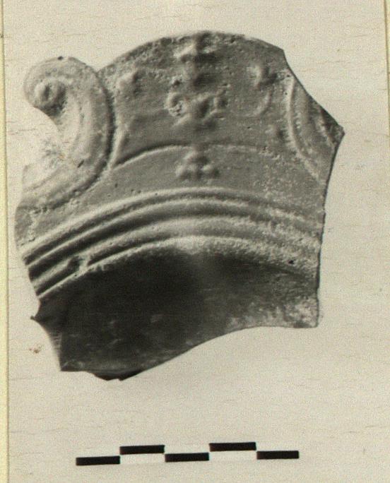 Description:   Low ring foot and shallow body, probably oval, or rectangular with rounded corners. Flat rim bordered inside with grooves, and with projecting scrolled lugs decorated with floral ornament in very low relief.