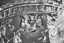| Description: | One small fragment missing. Two upper terminal bands: horizontal spirals and leaves above; egg and dart below. Body: antithetic goats and krater group; Erotes, bird and garland, and cluster of grapes, repeated. Medallion: double flower encircled by three rows of small leaves. Pinkish-buff clay; black glaze peeled on one side. | |