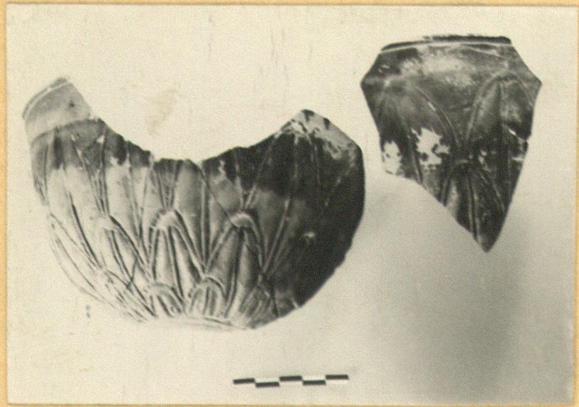 | Description: | Under half preserved, from rim to bottom. Three rows of leaves increasing in size towards top with flower(?) between upper leaves. Segment of medallion preserved. Pinkish-buff clay, glaze shading black to orange, much peeled. | |