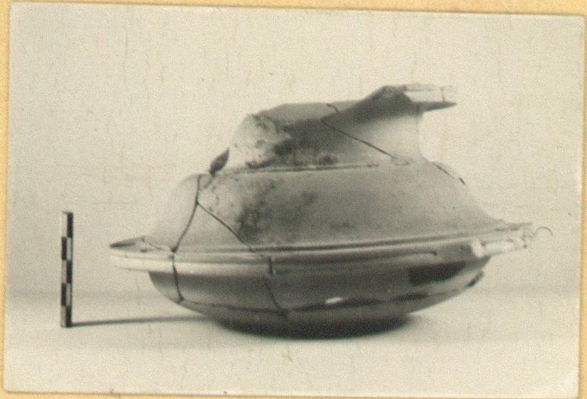 | Description: | The stand missing and minor fragments of bowl, including part of lower wall and of rim. Rounded lower bowl; double-curved upper bowl with flange between. The flange lightly grooved on its upper face, and with a deep groove around the vertical face. A slight offset at the base of the neck; spreading rim, grooved on outer face. Three tie-holes, evenly spaced, pierced through the flange; two (probably were three) in the rim. Soft pinkish-buff clay. | |