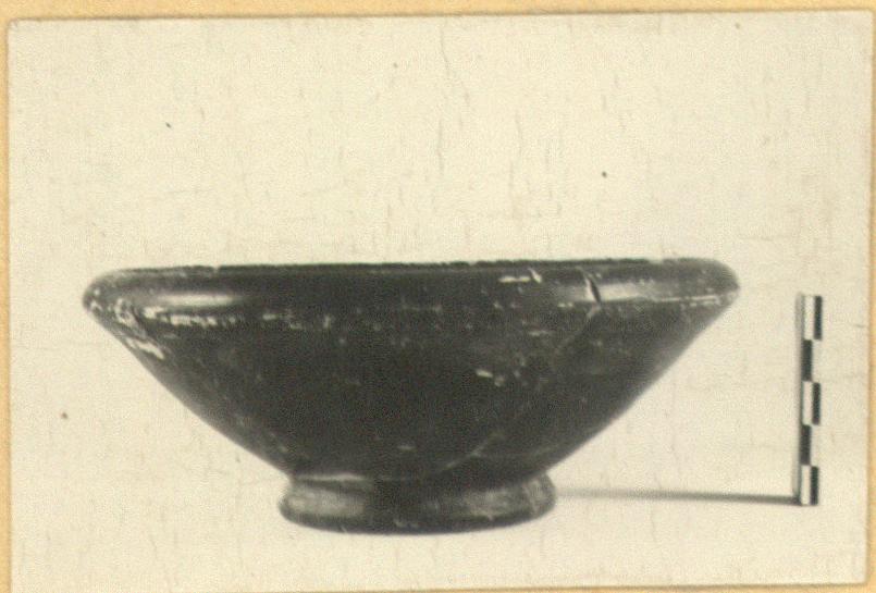 | Description: | Minor fragments missing. Bowl with inturned rim; ring foot. Pinkish-buff clay; black glaze. | |