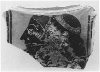 | Description: | Handle fragment. The handle is the colonnette krater type, the horizontal top piece being preserved except for the outer corners, of which the left has lost a fairly large piece, the right a small one. Underneath can be seen the stump of the vertical support. A female head is seen in profile against a parallel male head; she is set in relief by applied creamy white for flesh color and by incision outlining the face. Incision also follows the wavy inner outline of the hair and borders the fillet of applied red. The eye, eyebrow and ear, are drawn in very fine incised lines; the hair falls in a mass down the back. The male head is distinguished by black for flesh and applied red for hair (its incised outline against the face nearly straight); high bridged nose and bearded chin; coarser incision for interior drawing. The usual distinction is made between male and female in the representation of the eye: his is exaggerated in size with a smaller concentric circle to represent the pupil, hers smaller, more elongated, with no incision for pupil. Incision is not used to set off the figures from the background, the composition being such that the color contrast around the edge is sharp. The lower part of the picture -the outer part of the handle surface- has lost a good deal of its color and the edge is chipped away somewhat. The line of chin and throat and start of shoulder or breast of the female can be traced by the incision, but no indication of the garment remains. A double line of brownish glaze frames the picture right and left; the worn inner and outer edges probably showed the same color. The vertical sides of the lug are decorated with a band formed by a succession of <graphic> Part of the inner surface of the krater is preserved; this is black glazed with a band of red near the top. | |