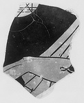 | Description: | Probably from wall of a kylix. To right, nude leg of man with bit of cloak behind. To left bit of basket. Relief contours. Along contour of basket, three strokes, applied in added red or dilute glaze, defining strings perhaps for suspension. | |