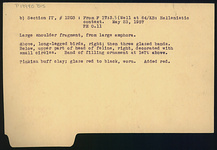 Description:   Broken all around; wall fragment from a large closed vase. Parts of helmeted heads of two warriors, facing left, each carrying a shield. Outline drawing with incised details on one of shields.