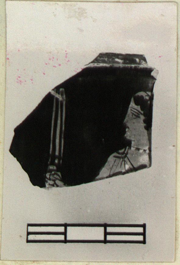 | Description: | Rim and wall fragment from a pyxis; wall slightly concave; lip inset to receive lid. The head and right shoulder of a woman, left, carrying a torch. White for the beads of her necklace and the flame of the torch. | |