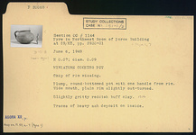 | Description: | Chip of rim missing. Plump, round-bottomed pot with one handle, from rim. Wide mouth, plain rim slightly out-turned. Slightly gritty reddish-buff clay. Traces of heavy ash deposit on inside. | |