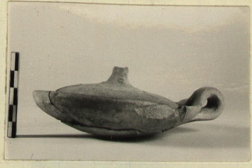 | Description: | Lid intact; few pieces missing from pot. Shallow round-bottomed pan with single vertical handle at rim; ridge on inside to receive lid. Plain lid, slightly domed, warped in making; rough picked-up knob. Rather heavy cooking pot fabric, similar to P 20065 (ΟΟ 1144). ADDENDA P 20065: Slightly gritty reddish-buff clay. | |