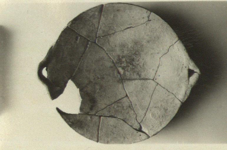 Description:   Ribbon-handled plate. Mended from many pieces; one fragment missing. The sides slope upwards slightly from the bottom, flat beneath. Two loop handles. Traces of burning inside and out.