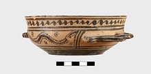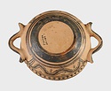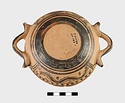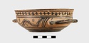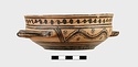 | Description: | Flat bottom, slight shoulder, straight vertical rim; rolled handles with out-turned ends. In panel between handles wavy glaze line bordered by dots; dot-rosettes as filling ornament below, two stripes and solid glaze to base. On rim, tangent dots. Interior glazed, but for reserved stripes inside rim. Pinkish-buff clay; glaze black to brownish. | |
