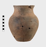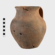 | Description: | A few chips missing from body. Flat bottom; shoulder relatively high passing in gentle curve into short neck and flaring rim. Wide strap handle rim to shoulder. Unglazed; surface wet-smoothed. Fired buff to red. Smoke-blackened from use. | |