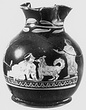 | Description: | Back of neck and handle missing; and scraps. Around the neck, olive wreath; ground line, egg and dot. The scene shows three children at play, with a dog; at left a nude boy, right, leaning forward, taking a stick to a small child crawling right to kiss a curly-tailed dog; at right, a boy wearing a himation, his right hand outstretched to the child. White for child and dot, with yellow drawing over; added clay for fillets. Firm black glaze; the resting surface and the space within the foot reserved. | |