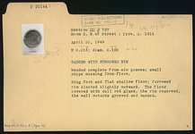 | Description: | Mended complete from six pieces; small chips missing from floor. Ring foot and flat shallow floor; furrowed rim slanted slightly outward. The floor covered with dull red glaze, the rim reserved, the wall outside grooved and banded. | |