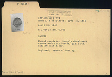 | Description: | Mended complete. Roughly wheel made saucer with flat bottom, plain rim, shallow flat floor. Unglazed; traces of burning. | |